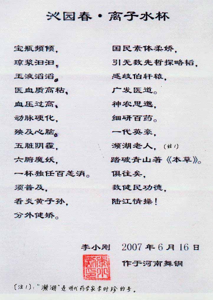 1. 本品倒入熱的或冷的開水,處理成富含4-6個水分子小簇團的微小分子團水。飲用后祛除上述疾病,包括各期原發(fā)性高血壓、單純收縮期高血壓、老年性高血壓、中過風(fēng)和做過"搭橋"或"支架"的冠心病患者。