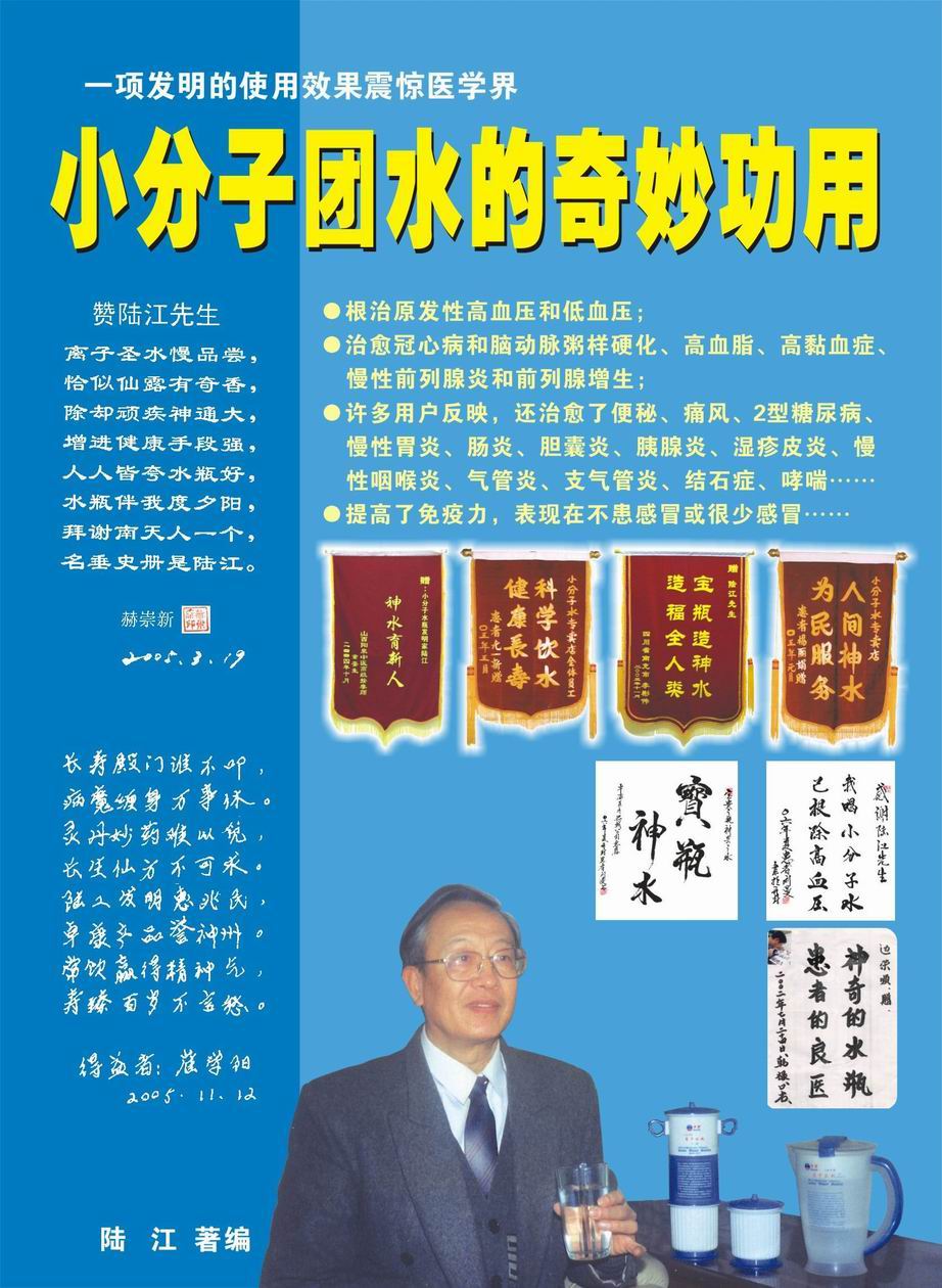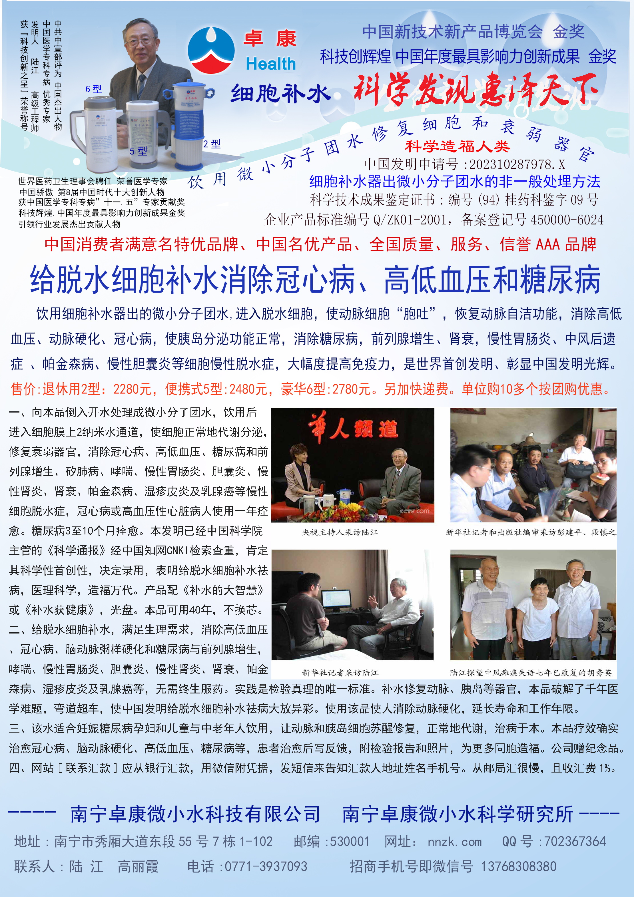 人類幾千年來患以上病癥需終生服藥,幾十年也不能治愈。可是我國南寧的高級工程師陸 江,于1990年想根治高血壓,研究發(fā)明了離子水瓶,處理出微小分子團水供飲用,經(jīng)過醫(yī)院臨床試用和專家鑒定,1999年獲中國發(fā)明專利權(quán),產(chǎn)品于2000年投放市場后一直跟蹤調(diào)查,據(jù)全國各地用戶反饋:祛除了高低血壓、糖尿病和冠心病,并使前列腺增生、咽喉炎、鼻竇炎、慢性氣管炎、支氣管炎、矽肺病、哮喘、慢性胃炎、腸炎、慢性膽囊炎、慢性腎炎、腎衰、膀胱炎、便秘、痔瘡、風(fēng)濕性關(guān)節(jié)炎和濕疹皮炎及中風(fēng)后遺癥等病癥不藥而愈。為什么喝微小水能治20多種病?陸 江從1991年德國科學(xué)家發(fā)現(xiàn)細胞膜水通道僅為2納米獲得啟發(fā),認為多種器官患病是因細胞脫水,不能正常代謝和分裂增殖,才使器官細胞減少致衰弱萎縮而形成細胞缺水性病癥。22年來的實踐有力地支持了“細胞脫水致病”這一重要論點,表明喝微小水可滿足細胞的生理需求,補水就能祛病,是生命科學(xué)新亮點。