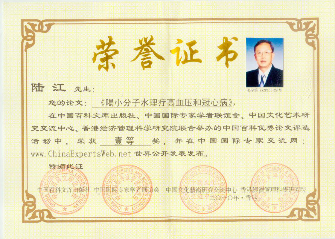 《飲用小分子水治療高血脂》獲優(yōu)秀論文獎